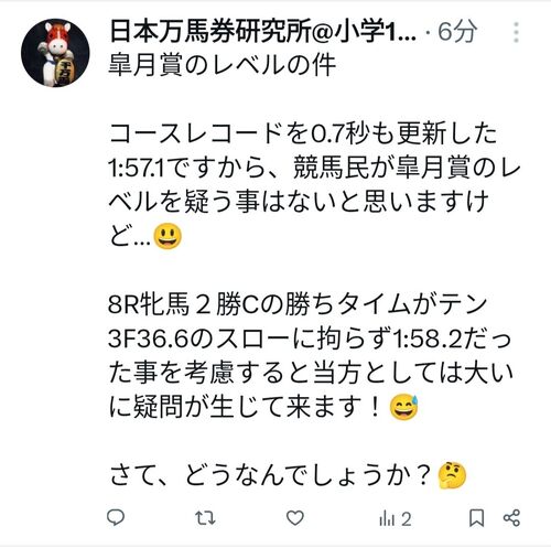 このブログはほぼ読者がいないので好きな事を好きな様に書けるのが最大のメリットである! …てな訳で「皐月賞のレベル」について☓で↓のように呟いた! 嘘は書いていないのだが、本心は全く書いていない! そもそも今年の皐月賞の前に競馬界では大きな不幸が…