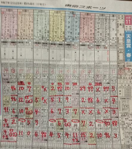 まずは、いつもの新聞から で、この段階で4歳馬の強さが抜けていると判断! そして出した結論がこれ↓ …でレースはスタート♪ サンライズ君がいつもより多少遅れて5番手、7.8枠の馬が後方になったけど3200mだから焦ることはない! レースは平均ペースで流れた…