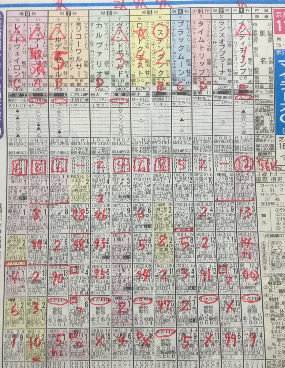 まずは、いつもの「しんがり指数」が書かれた東京スポーツの馬柱から