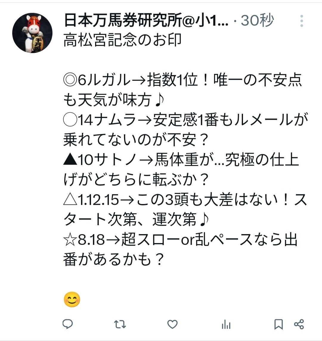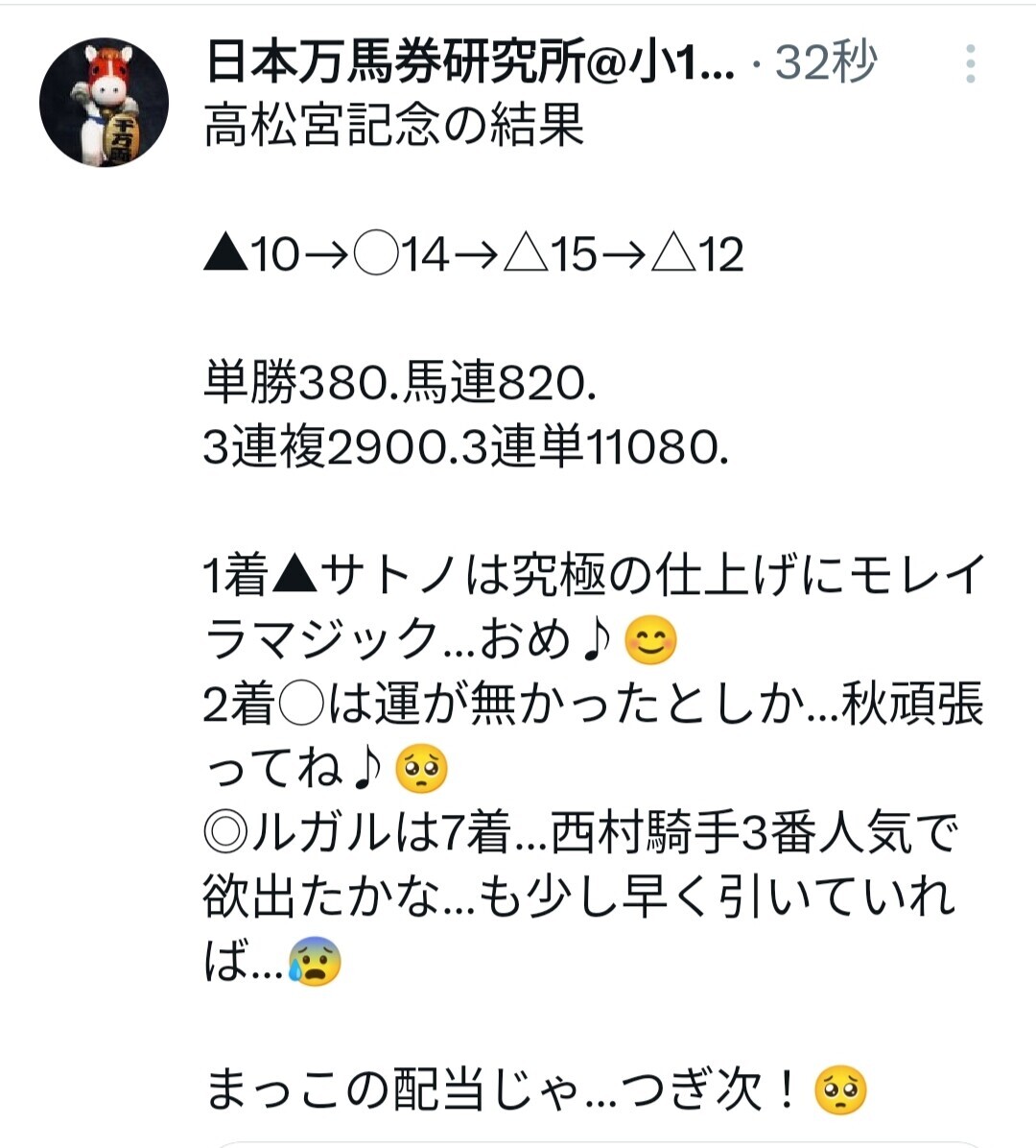 我が本命◎ルガル君は前半飛ばしすぎ、いつも通り3番手に抑えたら違う展開になった可能性もありますけど…スプリンターズS1着は9人気で気軽に乗れた西村騎手ですが、今回は3番人気で秋春連覇に欲が出たのかも…まぁこの騎手心理を見逃したのが我が敗因です!😭